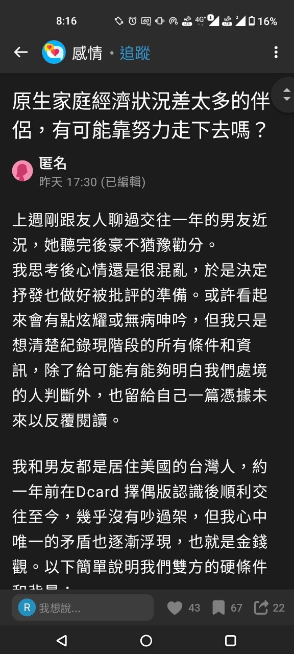他追求我時和交往前期他會全付,但之後反應由於我們家境懸殊,所以希望我能多負擔一