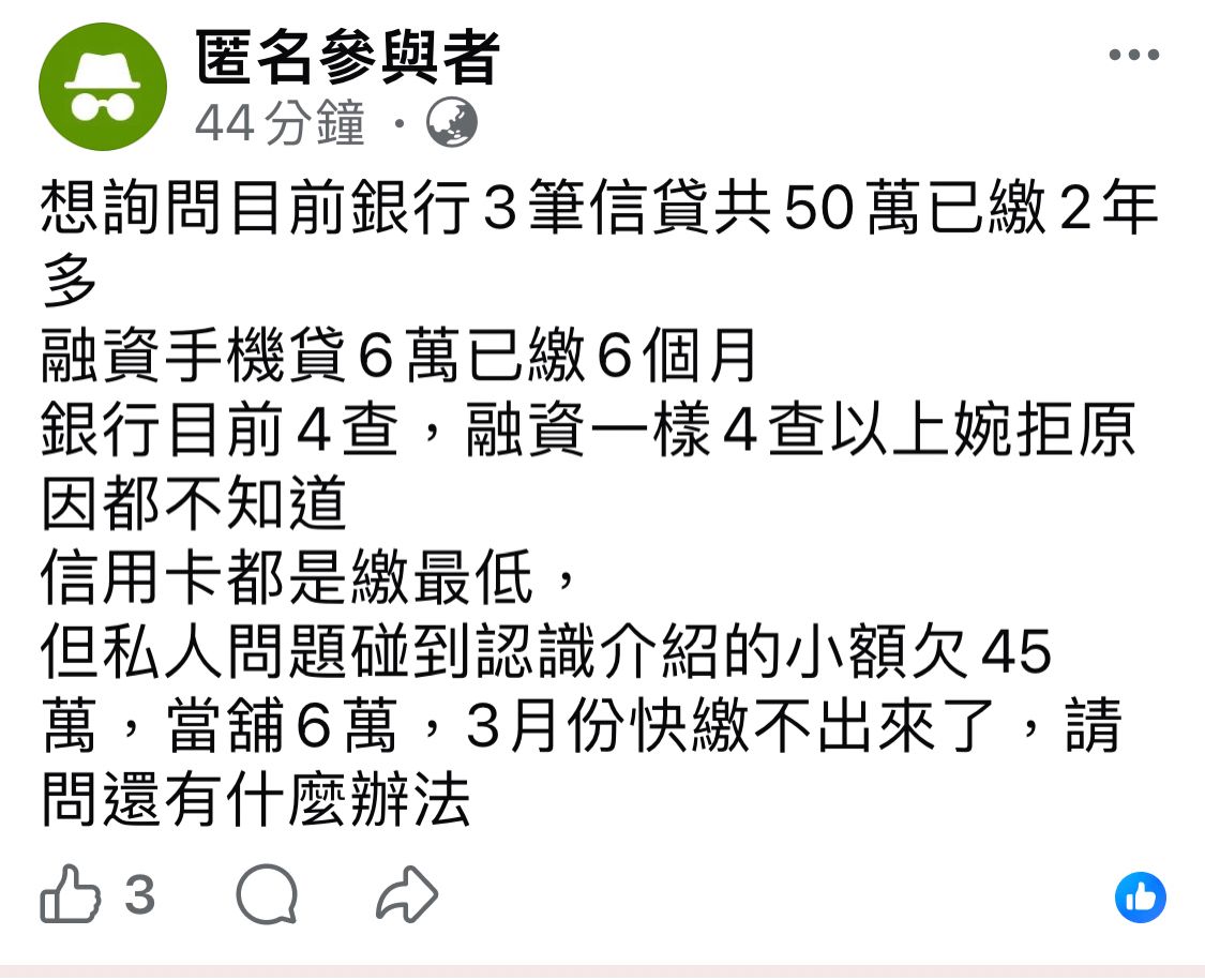 但私人問題碰到認識介紹的小額欠45萬,當舖6萬,3月份快繳不出來了,請問還有什麼辦