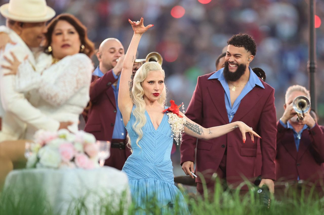 政治議題躍超級盃舞台!Lady Gaga淺藍禮服搭配紅花胸針致敬波多黎各