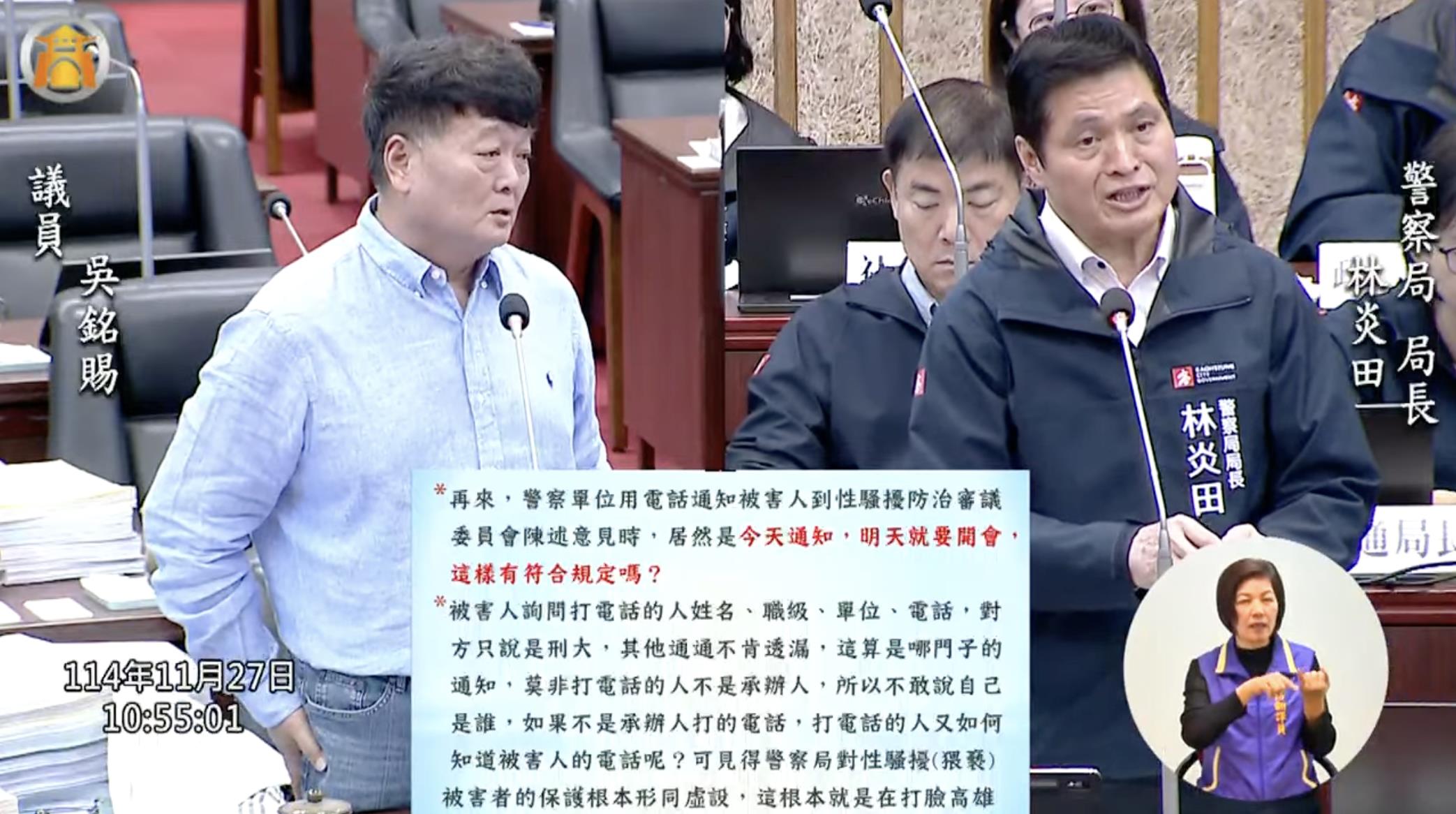 吳銘賜今在議會質詢表示,警察單位後來用電話通知被害人到性騷擾防治審議委員會陳述